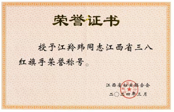 近日,集團(tuán)員工江羚瑋榮獲江西省婦女聯(lián)合會(huì)授予的江西省“三八紅旗手”榮譽(yù)稱號(hào)。