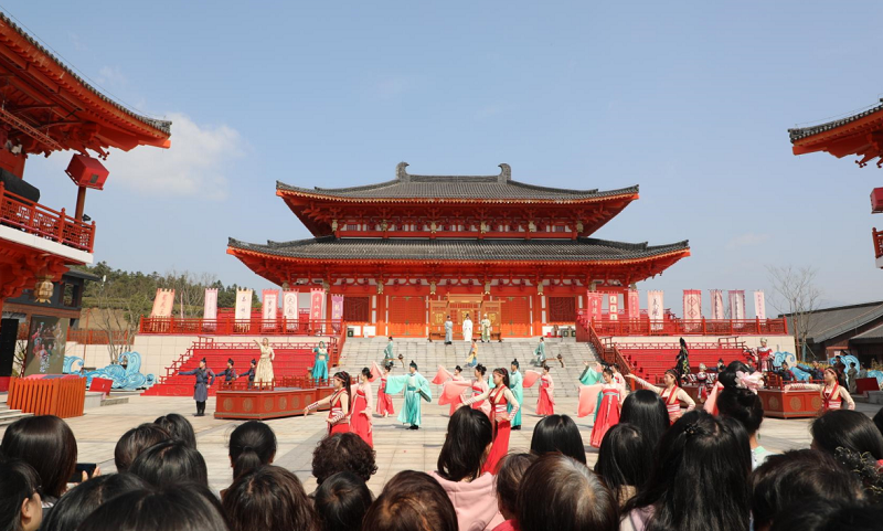 隨后,眾人在山頂休息片刻后,便一同下山前往大唐茶市觀(guān)看演出。古色古香的大唐茶市唐風(fēng)演藝小鎮(zhèn),一場(chǎng)大型沉浸式茶文化古風(fēng)演出正在上演,茶市街口人群涌動(dòng),商旅云集,《大唐茶市》表演將演出、展陳與地方特色商業(yè)業(yè)態(tài)巧妙融合在一起,大家紛紛都湊近距離認(rèn)真觀(guān)看。感受了一番浮梁人杰地靈的風(fēng)情特色和源遠(yuǎn)流長(zhǎng)的茶文化歷史。